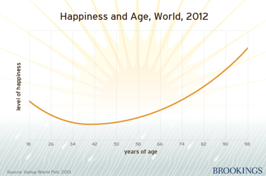 Fortunately, REAL data from Gallup (based on hundreds of thousands of people worldwide) shows a different story. Happiness does dip in your 20s and 30s, then steadily climbs starting in your 40s.